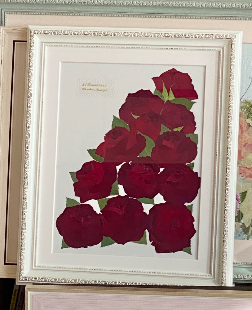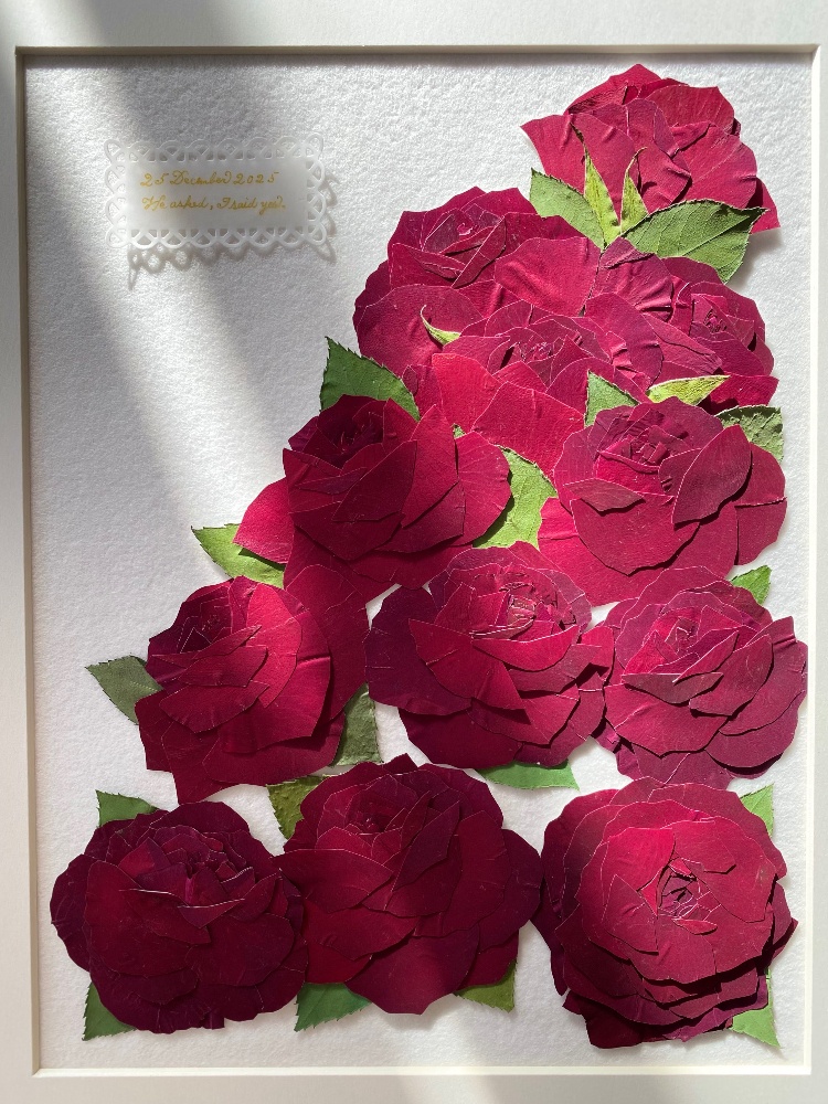 群馬県内だけでなくありがたい事に県外からのご依頼もいただきます。(●︎^-^●︎)とっても大輪の赤いバラのプロポーズブーケでした。半分だけお預かりして技術を使い、12本のダズンローズを咲かせました。シンプルでお花の輪郭が一輪ずつわかるデザインをご希望です。お客様のお好みに合わせてご一緒に楽しみつつ、記念のお花をお残ししています。(●︎^-^●︎)
